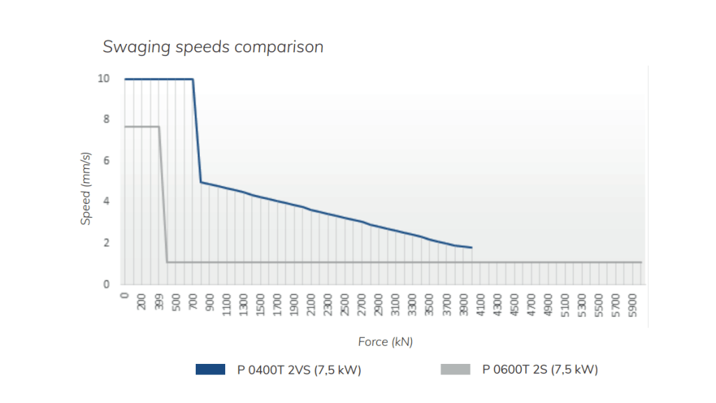 The variable speed feature is not only allowing for a superior speed over the full swaging cycle, but also allows the operator to control the speed of the swaging operation. By turning the speed adjustment to the maximum, the piston will swage at a speed of 10 mm/s and as it builds pressure it will gradually slow down with a minimum value of 1,8 mm/s at a full force of 400 tonnes